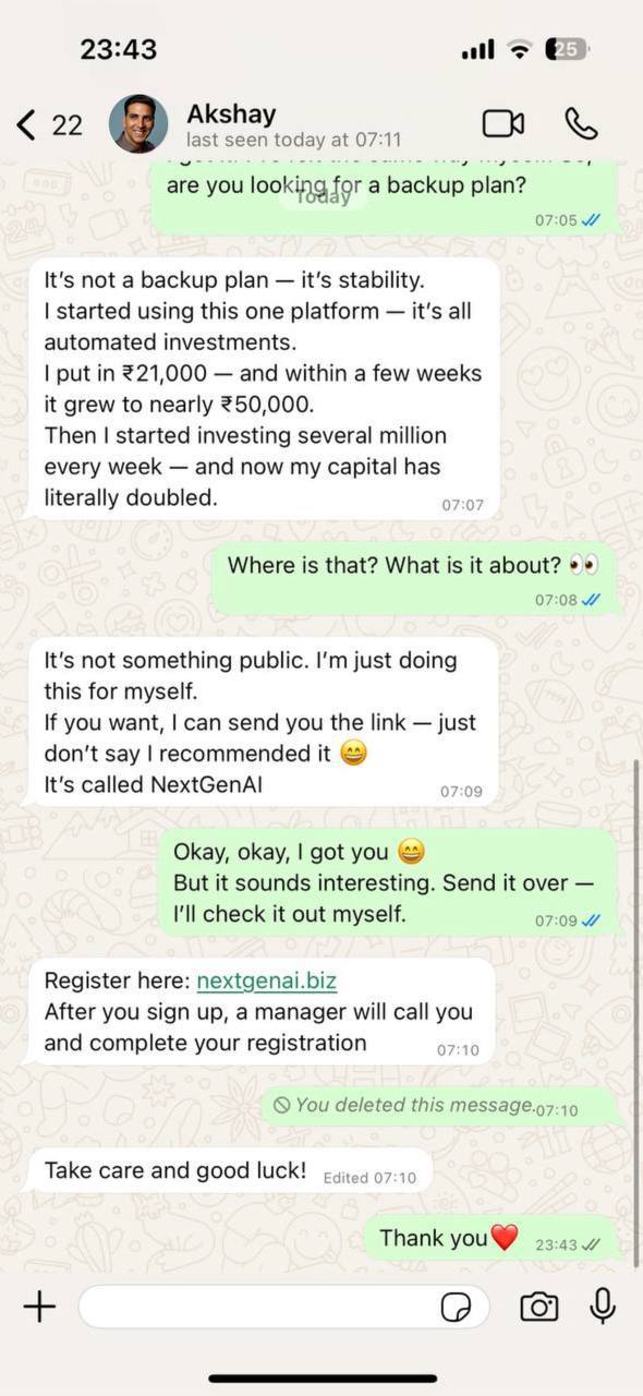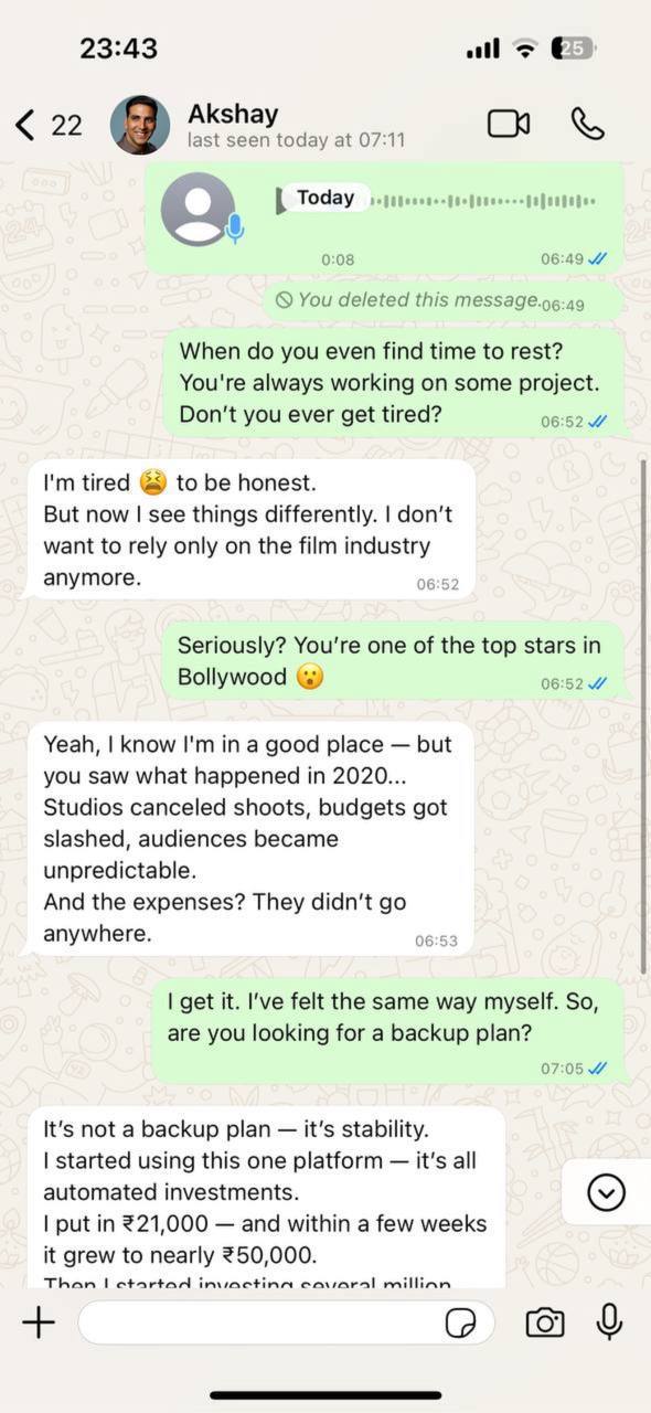 We reached out to Akshay Kumar to clarify the situation. The actor confirmed the authenticity of the leaked messages and admitted that he indeed uses the NextGenAI platform for automated investments.